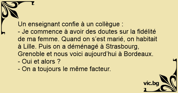 - Je commence à avoir des doutes sur la fidélité de ma femme. Quand on s’est marié, on habitait à Lille. Puis on a déménagé à Strasbourg, Grenoble et nous voici aujourd’hui à Bordeaux.