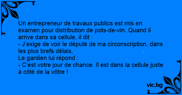 Un entrepreneur de travaux publics est mis en examen pour distribution de pots-de-vin. Quand il arrive dans sa cellule, il dit :