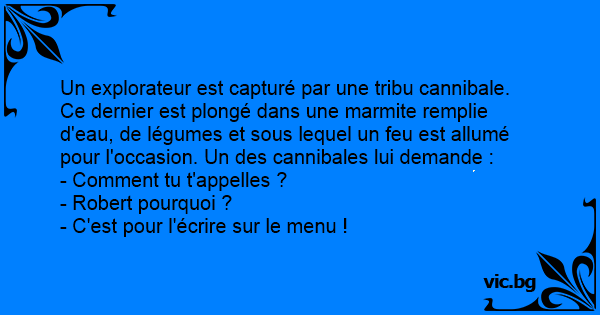 Un explorateur est capturé par une tribu cannibale. Ce dernier est plongé dans une marmite remplie d'eau, de légumes et sous lequel un feu est allumé pour l'occasion. Un des cannibales lui demande :