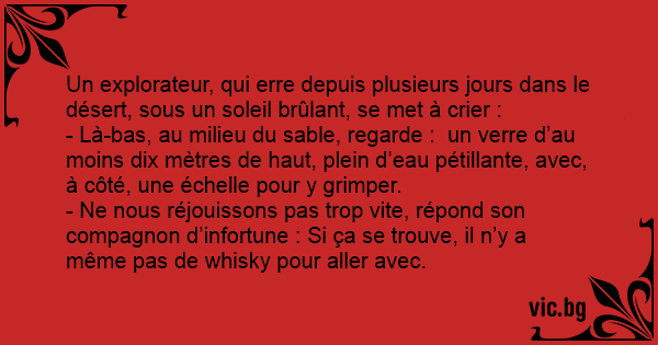 - Ne nous réjouissons pas trop vite, répond son compagnon d’infortune : Si ça se trouve, il n’y a même pas de whisky pour aller avec.