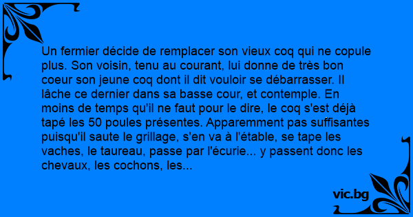 Un fermier décide de remplacer son vieux coq qui ne copule plus. Son voisin, tenu au courant, lui donne de très bon coeur son jeune coq dont il dit vouloir se débarrasser. Il lâche ce dernier dans sa basse cour, et contemple. En moins de temps qu'il ne faut pour le dire, le coq s'est déjà tapé les 50 poules présentes. Apparemment pas suffisantes puisqu'il saute le grillage, s'en va à l'étable, se tape les vaches, le taureau, passe par l'écurie... y passent donc les chevaux, les cochons, les pigeons, la fermière. Le fermier ravi, en conclu que ce n'est pas si mal, puisqu'il a trouvé un coq de taille. Tout à coup, un aigle passe par là, et commence à tourner autour du coq. Le fermier, affolé s'en va chercher son fusil: on ne va quand même pas lui voler le meilleur coq qu'il ai jamais eu !