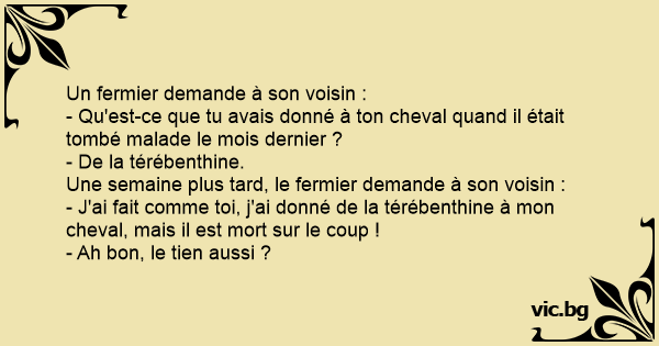 - J'ai fait comme toi, j'ai donné de la térébenthine à mon cheval, mais il est mort sur le coup !