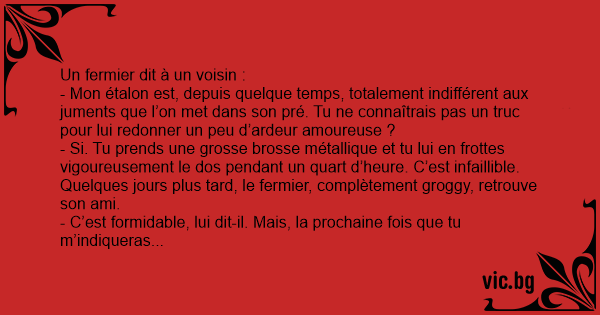 - Mon étalon est, depuis quelque temps, totalement indifférent aux juments que l’on met dans son pré. Tu ne connaîtrais pas un truc pour lui redonner un peu d’ardeur amoureuse ?