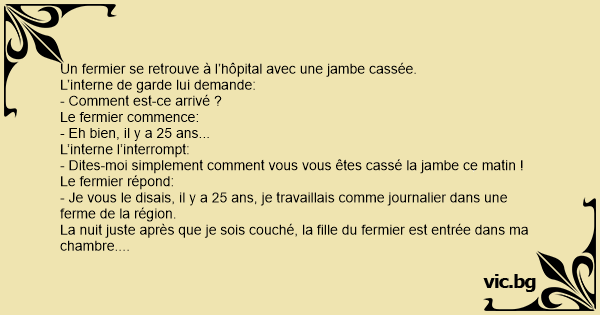 - Dites-moi simplement comment vous vous êtes cassé la jambe ce matin !
