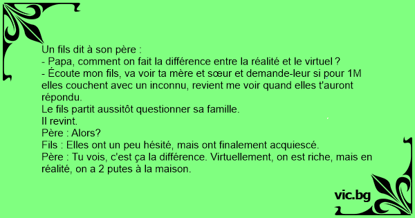 Père : Tu vois, c'est ça la différence. Virtuellement, on est riche, mais en réalité, on a 2 putes à la maison.