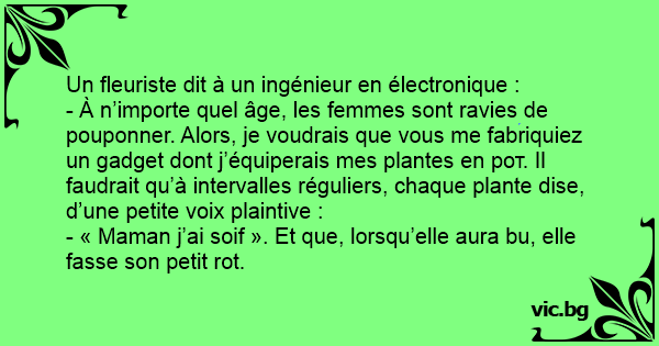 - À n’importe quel âge, les femmes sont ravies de pouponner. Alors, je voudrais que vous me fabriquiez un gadget dont j’équiperais mes plantes en рот. Il faudrait qu’à intervalles réguliers, chaque plante dise, d’une petite voix plaintive :