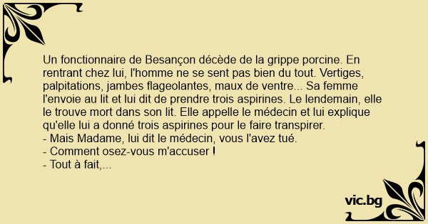 Un fonctionnaire de Besançon décède de la grippe porcine. En rentrant chez lui, l'homme ne se sent pas bien du tout. Vertiges, palpitations, jambes flageolantes, maux de ventre... Sa femme l'envoie au lit et lui dit de prendre trois aspirines. Le lendemain, elle le trouve mort dans son lit. Elle appelle le médecin et lui explique qu'elle lui a donné trois aspirines pour le faire transpirer.
