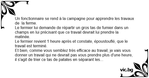 Mais quand le fermier revient, le fonctionnaire n'a absolument rien fait, il tient une grosse patate dans une main et une petite dans l'autre.