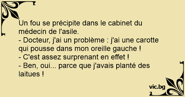 - Docteur, j'ai un problème : j'ai une carotte qui pousse dans mon oreille gauche !