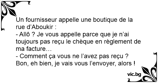 - Allô ? Je vous appelle parce que je n’ai toujours pas reçu le chèque en règlement de ma facture…