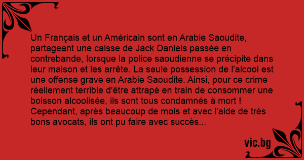Un Français et un Américain sont en Arabie Saoudite, partageant une caisse de Jack Daniels passée en contrebande, lorsque la police saoudienne se précipite dans leur maison et les arrête. La seule possession de l'alcool est une offense grave en Arabie Saoudite. Ainsi, pour ce сriме réellement terrible d'être attrapé en train de consommer une boisson alcoolisée, ils sont tous condamnés à mort ! Cependant, après beaucoup de mois et avec l'aide de très bons avocats, ils ont pu faire avec succès appel de leur