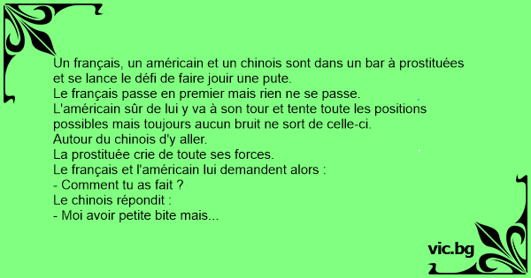 Un français, un américain et un chinois sont dans un bar à prostituées et se lance le défi de faire jouir une рuте.