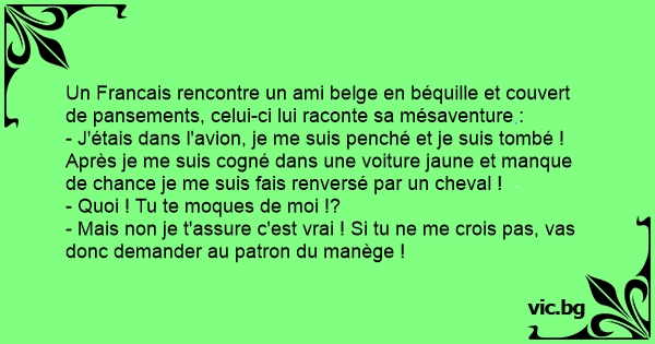 Un Francais rencontre un ami belge en béquille et couvert de pansements, celui-ci lui raconte sa mésaventure :