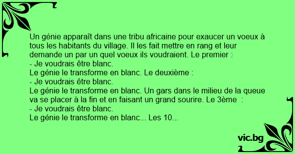 Un génie apparaît dans une tribu africaine pour exaucer un voeux à tous les habitants du village. Il les fait mettre en rang et leur demande un par un quel voeux ils voudraient. Le premier :