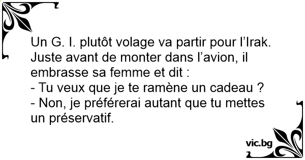 Un G. I. plutôt volage va partir pour l’Irak. Juste avant de monter dans l’avion, il embrasse sa femme et dit :