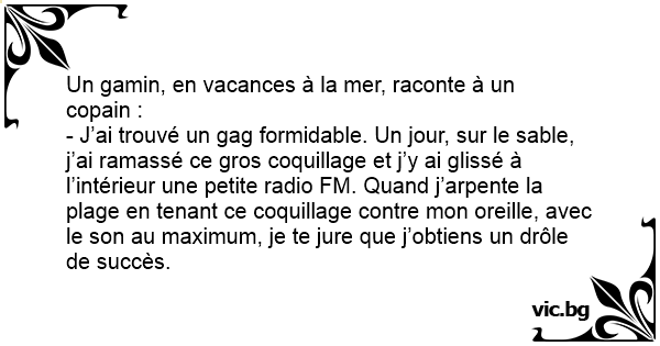 - J’ai trouvé un gag formidable. Un jour, sur le sable, j’ai ramassé ce gros coquillage et j’y ai glissé à l’intérieur une petite radio FM. Quand j’arpente la plage en tenant ce coquillage contre mon oreille, avec le son au maximum, je te jure que j’obtiens un drôle de succès.