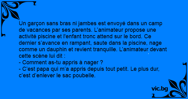 Un garçon sans bras ni jambes est envoyé dans un camp de vacances par ses parents. L’animateur propose une activité piscine et l'enfant tronc attend sur le bord. Ce dernier s’avance en rampant, saute dans la piscine, nage comme un dauphin et revient tranquille. L’animateur devant cette scène lui dit :