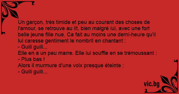 Un garçon, très timide et peu au courant des choses de l'amour, se retrouve au lit, bien malgré lui, avec une fort belle jeune fille nue. Ca fait au moins une demi-heure qu'il lui caresse gentiment le nombril en chantant :