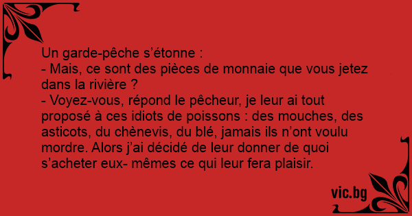 - Voyez-vous, répond le pêcheur, je leur ai tout proposé à ces idiots de poissons : des mouches, des asticots, du chènevis, du blé, jamais ils n’ont voulu mordre. Alors j’ai décidé de leur donner de quoi s’acheter eux- mêmes ce qui leur fera plaisir.