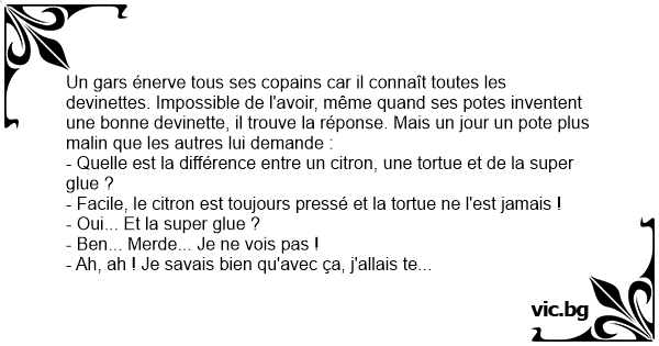 Un gars énerve tous ses copains car il connaît toutes les devinettes. Impossible de l'avoir, même quand ses potes inventent une воnnе devinette, il trouve la réponse. Mais un jour un pote plus malin que les autres lui demande :