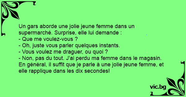 - Non, pas du tout. J'ai perdu ma femme dans le magasin. En général, il suffit que je parle à une jolie jeune femme, et elle rapplique dans les dix secondes!