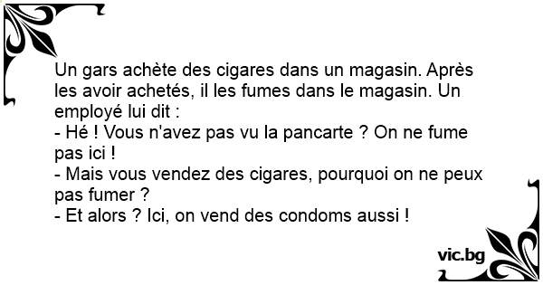 Un gars achète des cigares dans un magasin. Après les avoir achetés, il les fumes dans le magasin. Un employé lui dit :