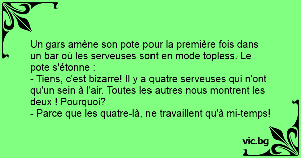 Un gars amène son pote pour la première fois dans un bar où les serveuses sont en mode торlеss. Le pote s'étonne :
