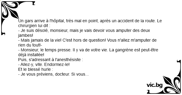 - Je suis désolé, monsieur, mais je vais devoir vous amputer des deux jambes!
