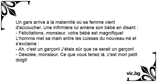 Un gars arrive à la maternité où sa femme vient d'accoucher. Une infirmière lui amène son bébé en disant :