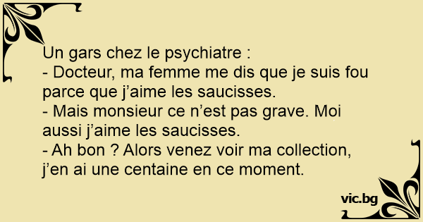 - Docteur, ma femme me dis que je suis fou parce que j’aime les saucisses.
