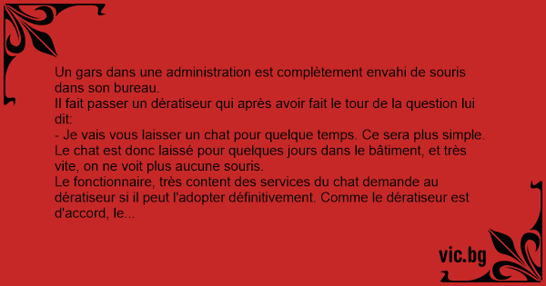 Le fonctionnaire, très content des services du chat demande au dératiseur si il peut l'adopter définitivement. Comme le dératiseur est d'accord, le chat reste dans les locaux.