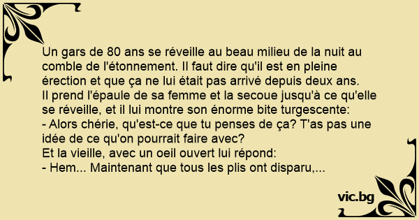 Un gars de 80 ans se réveille au beau milieu de la nuit au comble de l'étonnement. Il faut dire qu'il est en pleine érection et que ça ne lui était pas arrivé depuis deux ans.