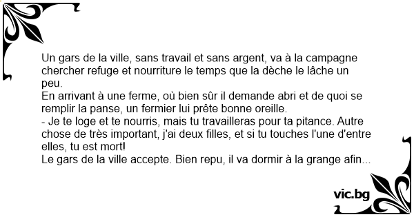 Le gars de la ville accepte. Bien repu, il va dormir à la grange afin d'être frais et dispos pour le lendemain. À la première heure le fermier va le chercher et l'amène aux champs afin qu'il gagne sa pitance.