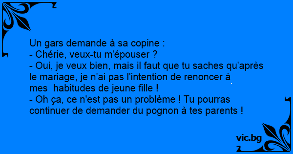 - Oui, je veux bien, mais il faut que tu saches qu'après le mariage, je n'ai pas l'intention de renoncer à mes habitudes de jeune fille !