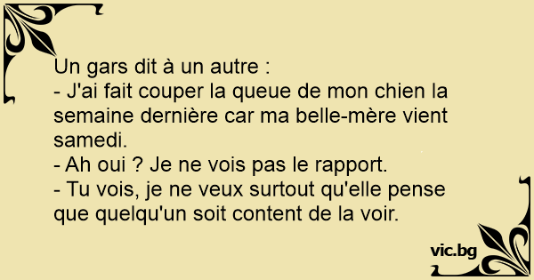 Мутра отива при ветеринарен лекар и води немска овчарка. Grafas sako savo liokajui: - Rytoj atvažiuoja mano žmonos motina. Prašau nukirsti šuniui uodegą. Noriu, kad niekas nesidžiaugtų, kad atvažiuoja uošvė! O sujeito ao saber que a querida sogra viria visita-los mandou cortar o rabo do cachorro. A mulher indignada, pergunta: - Mas querido, por quê voce fez isso? - Quanto sua mãe chegar eu não quero... Hørt hos dyrlægen: - Vil de ikke nok skære hele halen af min hund? - Hvorfor dog det? - Min svigermor kommer på besøg, og hun må absolut ikke se tegn på at hun er velkommen! Facet z pięknym psem przychodzi do weterynarza i mówi: prosze obciąć psu ogon. - Weterynarz na to, szkoda, taki piękny pies - Właściciel: proszę nie dyskutować tylko ciąć. - Ale dlaczego? -... Bert took his Saint Bernard to the vet. "Doctor," he said sadly, "I'm afraid I'm going to have to ask you to cut off my dog's tail." The vet stepped back, "Bert, why should I do such a terrible... Una signora porta il cane dal veterinario e gli chiede di tagliare la coda all'animale. Il dottore lo visita e poi chiede alla padrona: "Il suo cane gode di ottima salute, perchè vuole tagliargli la coda?" "Perchè domani arriva mia suocera e non vorrei che, vedendolo scodinzolare, credesse di... O sujeito leva o cachorro ao veterinário. — Eu quero cortar o rabo do meu cachorro! O veterinário, acostumado a esse tipo de serviço, obedece calado. Vinte minutos depois está de volta. — Pronto,... - ¡Querida! ¿Mañana viene a cenar tu madre? - ¡Si amor! ¿Por qué esa pregunta? - ¡Para cortarle la cola al perro! No quiero que nadie de muestras de alegría cuando llegue esa vieja!