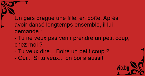 Un gars drague une fille, en boîte. Après avoir dansé longtemps ensemble, il lui demande :