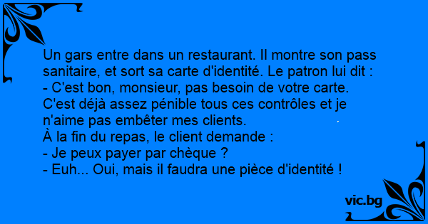 Un gars entre dans un restaurant. Il montre son pass sanitaire, et sort sa carte d'identité. Le patron lui dit :