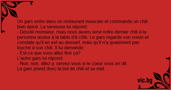 - Désolé monsieur, mais nous avons servi notre dernier chili à la personne assise à la table d'à côté. Le gars regarde son voisin et constate qu'il en est au dessert, mais qu'il n'a quasiment pas touché à son chili. Il lui demande: