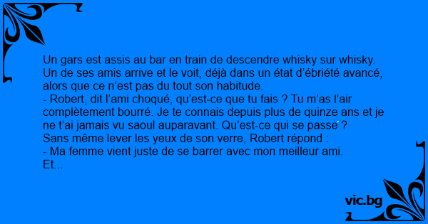 - Robert, dit l’ami choqué, qu’est-ce que tu fais ? Tu m’as l’air complètement bourré. Je te connais depuis plus de quinze ans et je ne t’ai jamais vu saoul auparavant. Qu’est-ce qui se passe ?