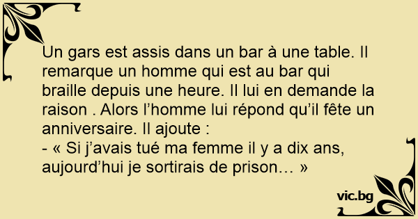 Un gars est assis dans un bar à une table. Il remarque un homme qui est au bar qui braille depuis une heure. Il lui en demande la raison . Alors l’homme lui répond qu’il fête un anniversaire. Il ajoute :