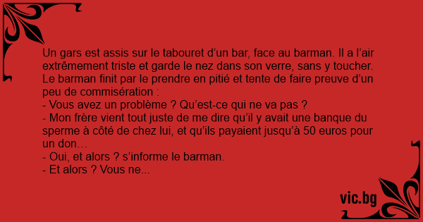 Un gars est assis sur le tabouret d’un bar, face au barman. Il a l’air extrêmement triste et garde le nez dans son verre, sans y toucher. Le barman finit par le prendre en pitié et tente de faire preuve d’un peu de commisération :