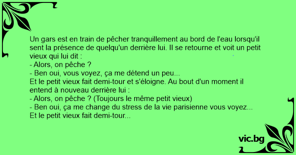 Un gars est en train de pêcher tranquillement au bord de l'eau lorsqu'il sent la présence de quelqu'un derrière lui. Il se retourne et voit un petit vieux qui lui dit :