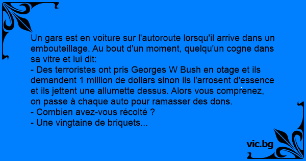- Des terroristes ont pris Georges W Bush en otage et ils demandent 1 million de dollars sinon ils l'arrosent d'essence et ils jettent une allumette dessus. Alors vous comprenez, on passe à chaque auto pour ramasser des dons.