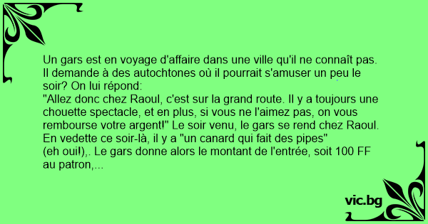 "Allez donc chez Raoul, c'est sur la grand route. Il y a toujours une chouette spectacle, et en plus, si vous ne l'aimez pas, on vous rembourse votre argent!" Le soir venu, le gars se rend chez Raoul. En vedette ce soir-là, il y a "un canard qui fait des pipes"