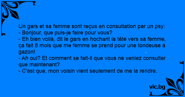 - Eh bien voilà, dit le gars en hochant la tête vers sa femme, ça fait 8 mois que me femme se prend pour une tondeuse à gazon!