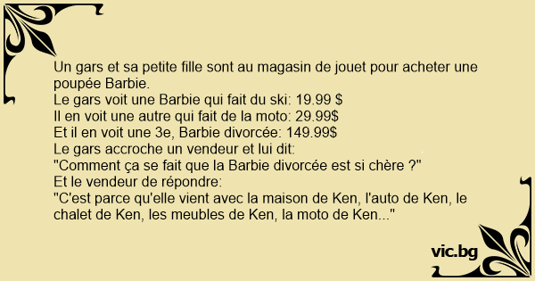 Přijde pán do obchodu a ptá se: „Za kolik máte panenku Barbie?” „Kterou máte namysli? Máme Barbie jede na dovolenou za 500 Kč, Barbie uklízí za 550 Kč, Barbie v koupelně za 600 Kč a Rozvedenou...