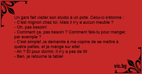 - C'est simple! Je demande à ma copine de se mettre à quatre pattes, et je mange sur elle!