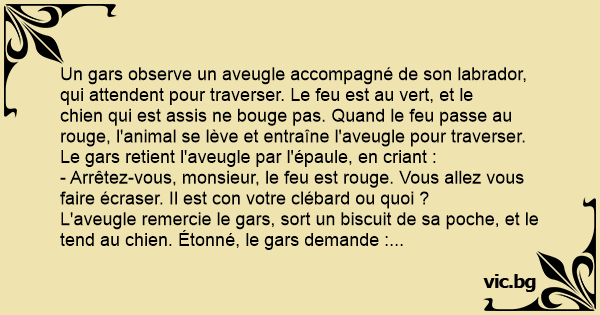 Un gars observe un aveugle accompagné de son labrador, qui attendent pour traverser. Le feu est au vert, et le chien qui est assis ne bouge pas. Quand le feu passe au rouge, l'animal se lève et entraîne l'aveugle pour traverser. Le gars retient l'aveugle par l'épaule, en criant :