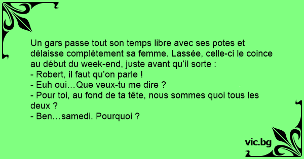 Un gars passe tout son temps libre avec ses potes et délaisse complètement sa femme. Lassée, celle-ci le coince au début du week-end, juste avant qu’il sorte :
