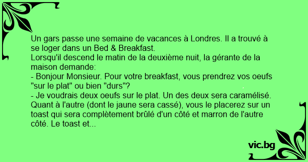 Un gars passe une semaine de vacances à Londres. Il a trouvé à se loger dans un Bed & Breakfast.